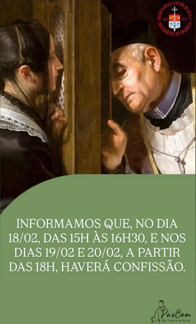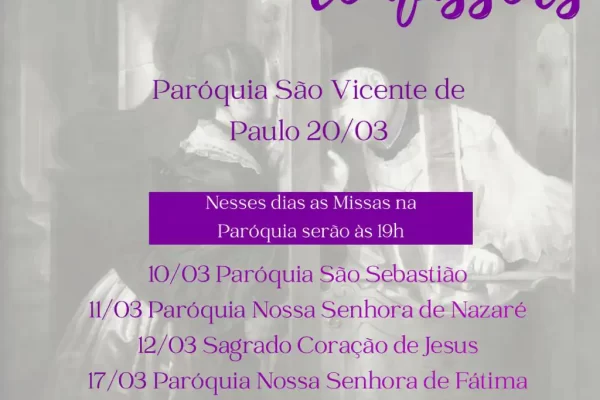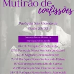 🙏 Mutirão de Confissões 📍 Paróquia São Vicente de Paulo📅 20/03 ⏰ Atenção:➡️ Nesses dias, as Missas na Paróquia serão às 19h 📆 Datas e paróquias do Mutirão: • 10/03 – Paróquia São Sebastião• 11/03 – Paróquia Nossa Senhora de Nazaré• 12/03 – Sagrado Coração de Jesus• 17/03 – Paróquia Nossa Senhora de Fátima• 18/03…