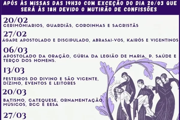 ✝️ Escala da Via-Sacra⛪ Paróquia São Vicente de Paulo 🕢 Após as missas das 19h30⚠️ Com exceção do dia 20/03, que será às 18h, devido ao Mutirão de Confissões. 📅 20/02Cerimoniários, Guardiãs, Coroinhas e Sacristãs 📅 27/02Ágape Apostolado e Discipulado, Abrasaí-vos, Kairós e Vicentinos 📅 06/03Apostolado da Oração, Cúria da Legião de Maria, Pastoral da…