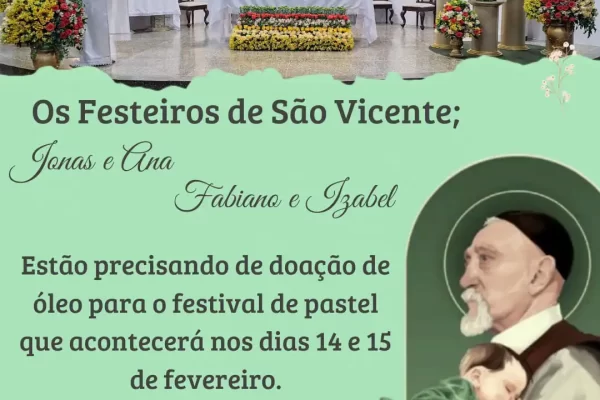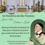 📣 Aviso dos Festeiros de São Vicente 👫 Festeiros:Jonas e AnaFabiano e Izabel 🛢️ Os festeiros estão precisando de doação de óleo para o Festival de Pastel, que acontecerá nos dias 14 e 15 de fevereiro. 🙏 Vamos fazer uma linda festa em honra ao nosso padroeiro!Contamos com a sua generosidade.Que São Vicente abençoe e…