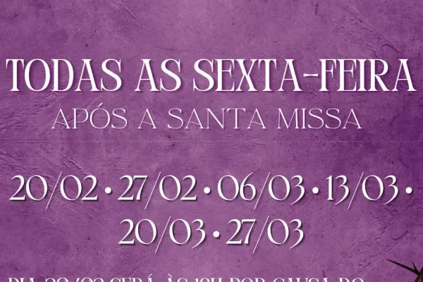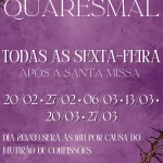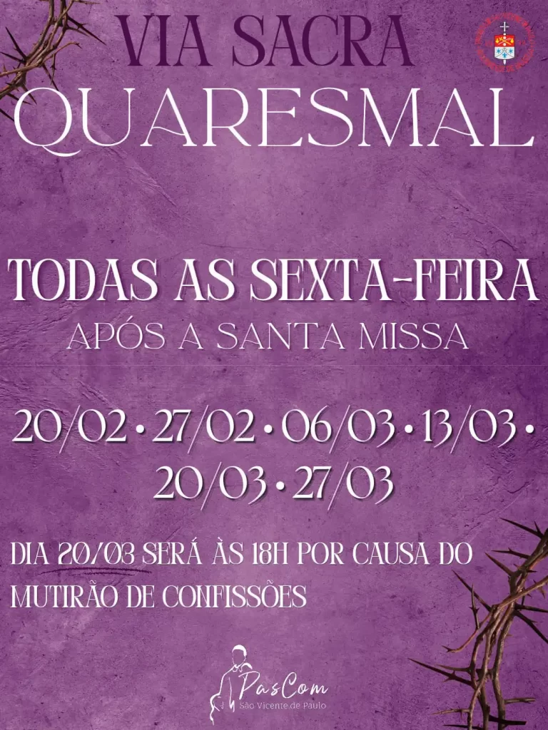 ✝️ VIA SACRA QUARESMAL 📅 Todas as sextas-feiras⛪ Após a Santa Missa 🗓 Datas:• 20/02• 27/02• 06/03• 13/03• 20/03• 27/03 ⏰ Atenção:➡️ No dia 20/03, a Via Sacra será às 18h, por causa do Mutirão de Confissões. 🙏 PASCOM – São Vicente de Paulo