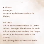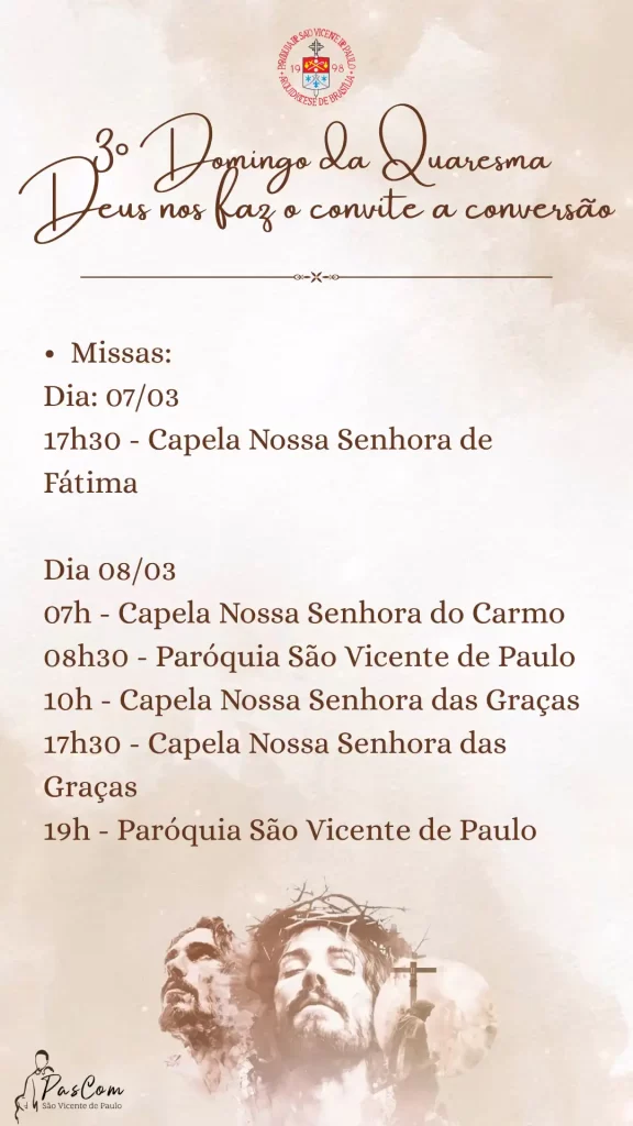✝️ 3º Domingo da QuaresmaDeus nos faz o convite à conversão. 📌 Missas: 📅 Dia 07/03🕔 17h30 – Capela Nossa Senhora de Fátima 📅 Dia 08/03🕖 07h – Capela Nossa Senhora do Carmo🕣 08h30 – Paróquia São Vicente de Paulo🕙 10h – Capela Nossa Senhora das Graças🕔 17h30 – Capela Nossa Senhora das Graças🕖 19h…