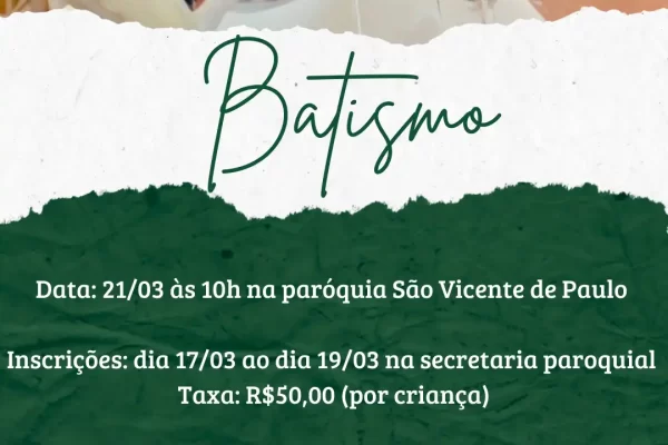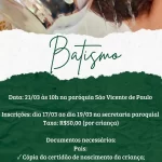 🙏 Batismo 📅 Data: 21/03⏰ Às 10h📍 Paróquia São Vicente de Paulo 📝 Inscrições:De 17/03…