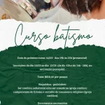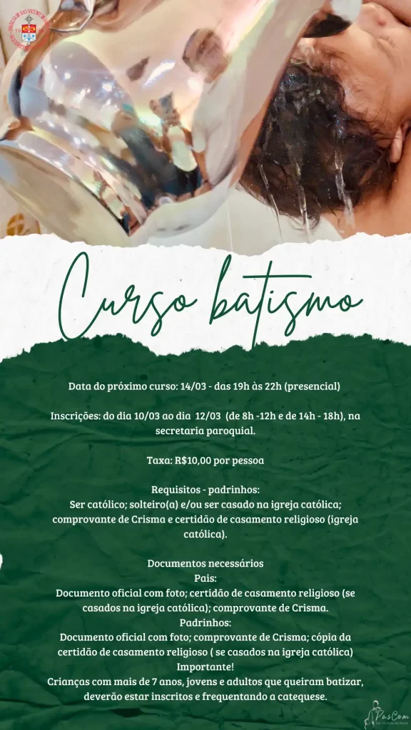 🙏 Curso de Batismo 📅 Data do próximo curso:14/03 – das 19h às 22h (presencial) 📝 Inscrições:De 10/03 a 12/03⏰ Das 8h às 12h e das 14h às 18h📍 Na secretaria paroquial 💰 Taxa: R$ 10,00 por pessoa 📌 Requisitos – padrinhos:• Ser católico• Ser solteiro(a) e/ou ser casado na Igreja Católica• Comprovante de Crisma…