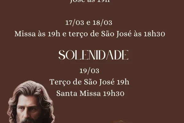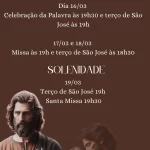 🙏 São José – Esposo da Virgem Maria 📅 Dia 16/03📖 Celebração da Palavra às 19h30📿 Terço de São José às 19h 📅 17/03 e 18/03⛪ Missa às 19h📿 Terço de São José às 18h30 ✨ Solenidade – 19/03📿 Terço de São José às 19h⛪ Santa Missa às 19h30 PasCom – São Vicente de Paulo