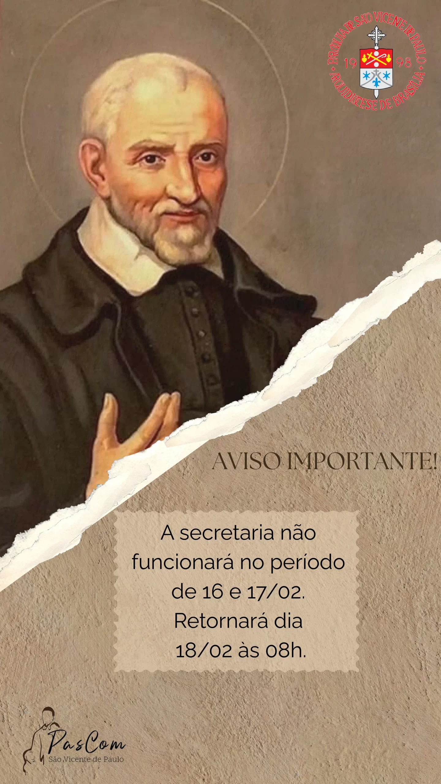 Informamos que a Secretaria Paroquial não funcionará nos dias 16 e 17/02.
