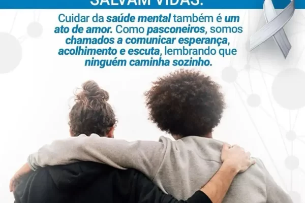 FALAR, OUVIR E CUIDAR SALVAM VIDAS. Cuidar da saúde mental também é um ato de amor. Como pasconeiros, somos chamados a comunicar esperança, acolhimento e escuta, lembrando que ninguém caminha sozinho.