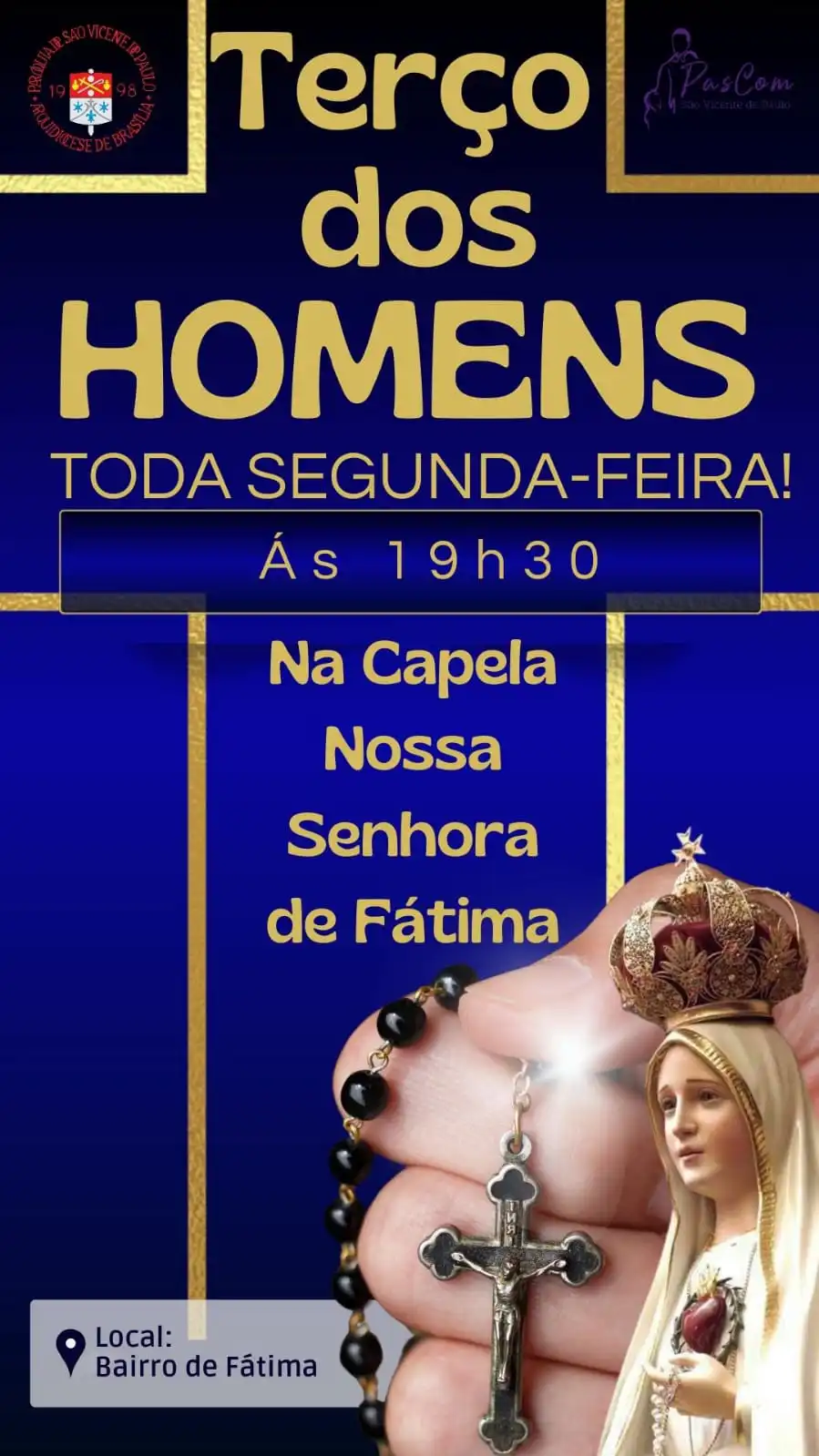 Convidamos todos os homens para participarem do Terço dos Homens, um momento especial de oração, fé e fraternidade, realizado toda segunda-feira, às 19h30, na Capela Nossa Senhora de Fátima, no Bairro de Fátima. Venha rezar conosco, fortalecer sua espiritualidade e confiar à intercessão de Nossa Senhora as intenções de sua família e de toda a comunidade. Sua presença é muito importante.